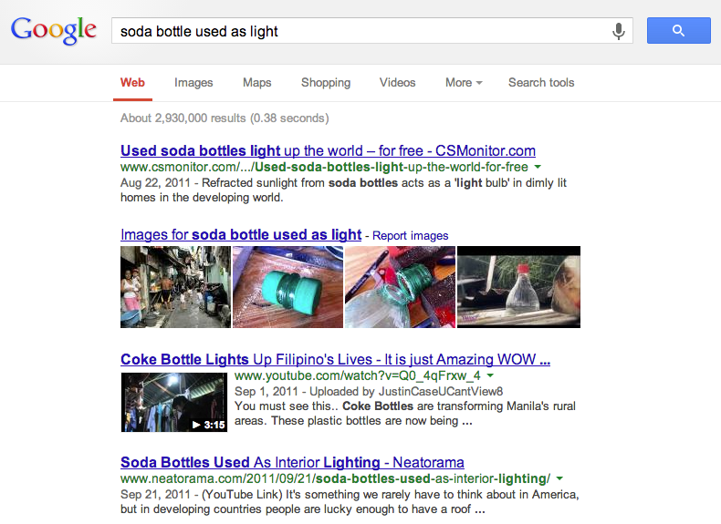 Let's start with the soda bottle. How does it relate to lighting? At first you might not think it does, but keep thinking and start asking questions. Could a bottle be somehow used as a light? Hmm ... the answer is yes! After a quick Google search, we find this gem. It turns out that water bottles are being used effectively in the third world as makeshift skylights, and it works incredibly well! Now we can extrapolate on this idea. Keep asking questions. What are the implications of this innovation? What does this mean for populations that prior to this innovation had no lighting? The article says it might actually save lives by reducing the fire risk associated with these populations being forced to use candles. Could we create a piece of content that attempts to quantify the benefits of this innovation in some way?