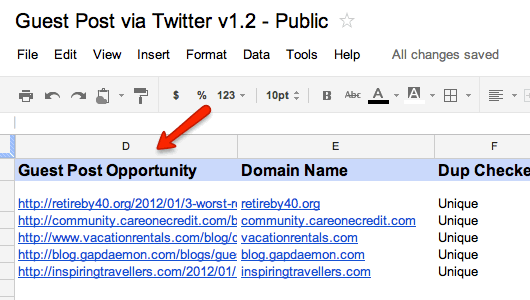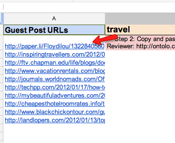 8. When you find a viable linking opportunity, paste the URL in column D: