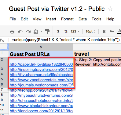 So, I made a tool that does all the heavy lifting. This tool pulls the same RSS feed that I had in my Google Reader into Google Docs, finds all of the t.co URLs, enlarges them, eliminates duplicates based on domain, and presents them in a nice package.