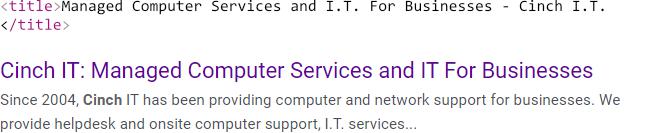 Here, Google has moved the brand name to the front, followed by a colon (:), and has also shortened “I.T.” to “IT”. This version (with “IT”) is nowhere to be found in the page source.