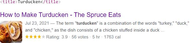 Channeling a bit of Goldilocks, sometimes your <title> tag is too long for Google and sometimes it’s too short. Here’s an example from a recipe result: