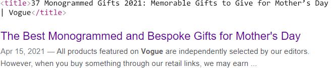 Here, Google took a perfectly nice <title> tag, and chose the <H1> that included both “Best” and “Bespoke” instead. This begs the question — are <title> tags with words like “Best” being rewritten because of specific content, or are they being rewritten because of other factors, like length or keyword-stuffing, that just happen to be correlated with that content?