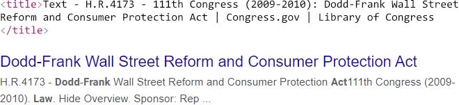 This text actually appears in the middle of the <title> tag, but it’s possible that it was extracted from somewhere else on the target page. I would argue that this is a pretty successful truncation that serves the search query (in this case, “Dodd Frank”).