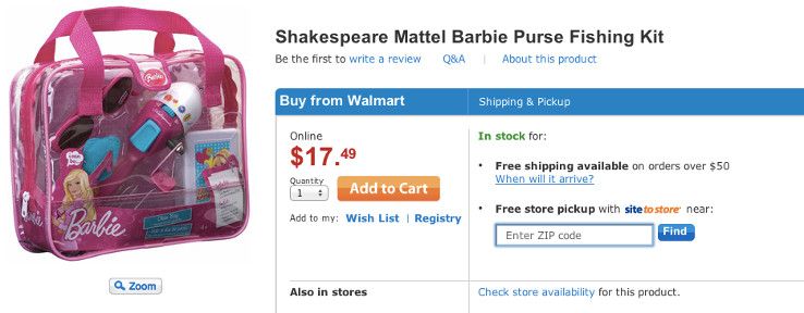 While yes, this is marketed toward girls, not women, this fishing set nicely illustrates pinkification. Turning it pink and labeling it with Barbie somehow makes it "for girls." But what really makes me upset is the language. Behold the "Purse" of fishing, which contains the exact same actual equipment as the Spider-Man one marketed toward boys.
