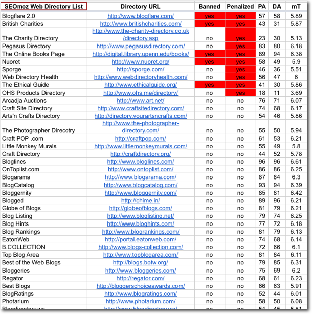 We gathered a total of 2,678 directories from lists like Val Web Design, SEOTIPSY.com, SEOmoz's own directory list (just the web directories were used), and a few others, the search for clues began. Out of the 2,678 directories, only 94 were banned – not too shabby. However, there were 417 additional directories that had avoided being banned, but had been penalized.