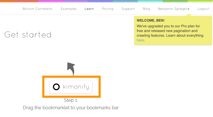 Signup is simple; just go to http://www.kimonolabs.com/signup and complete the form. You will then be brought to a welcome page where you will be asked to drag their bookmarklet into your bookmarks bar.