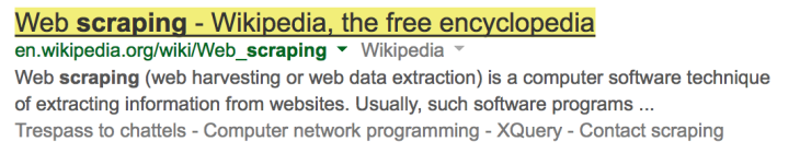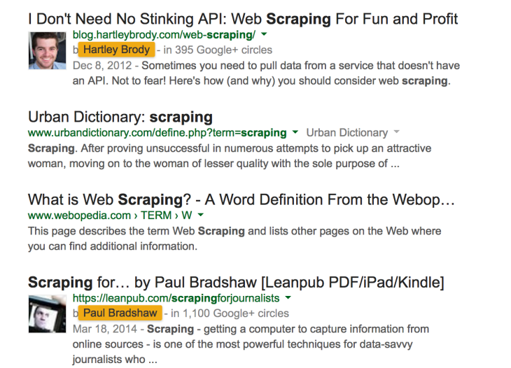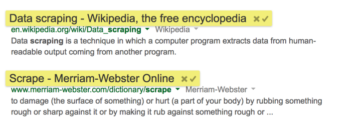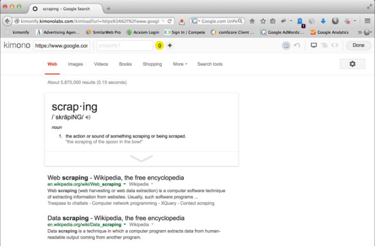 Simply navigate your browser to Google and perform a search; in this example I am going to use the term "scraping." Once the results pages are displayed, press the kimonify button (in some cases you might need to search again). Once you complete your search you should see a screen like the one below: