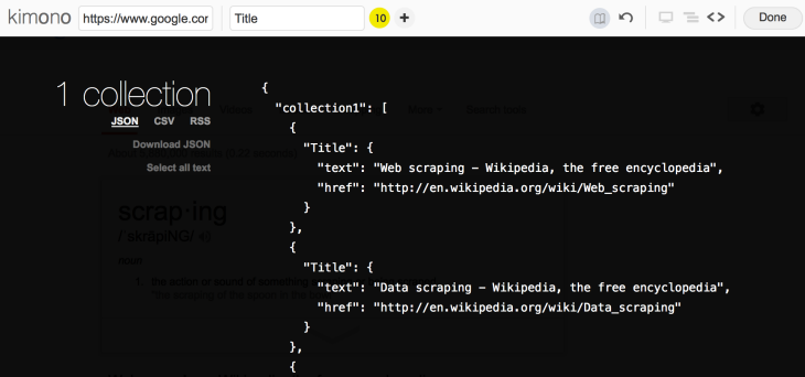 The purpose of a tool like Kimono is to take unstructured data (not organized or exportable) and convert it into a structured format. The prime example of this is any ranking tool. A ranking tool reads Google's results page, extracts the information and, based on certain rules, it creates a visual view of the data which is your ranking report.