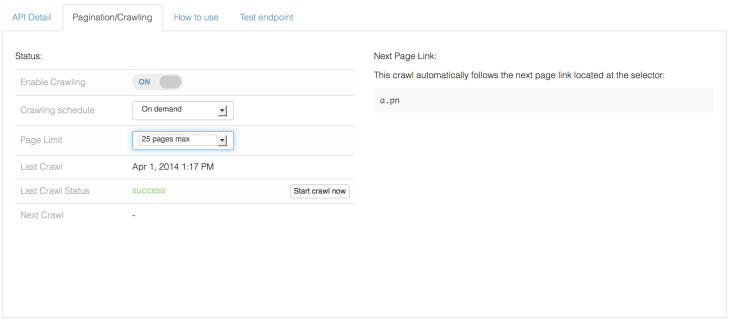 To collect the listings requires a quick setup. Click on the pagination tab, turn it on and set your schedule to On demand to pull data when you ask it to. Your screen should look like this: