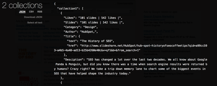 Now it's time to confirm the data; just click on the little Data icon to see a preview of the actual data this page would collect. In the data view you can switch between different formats (JSON, CSV and RSS). If everything went well, it should look like this: