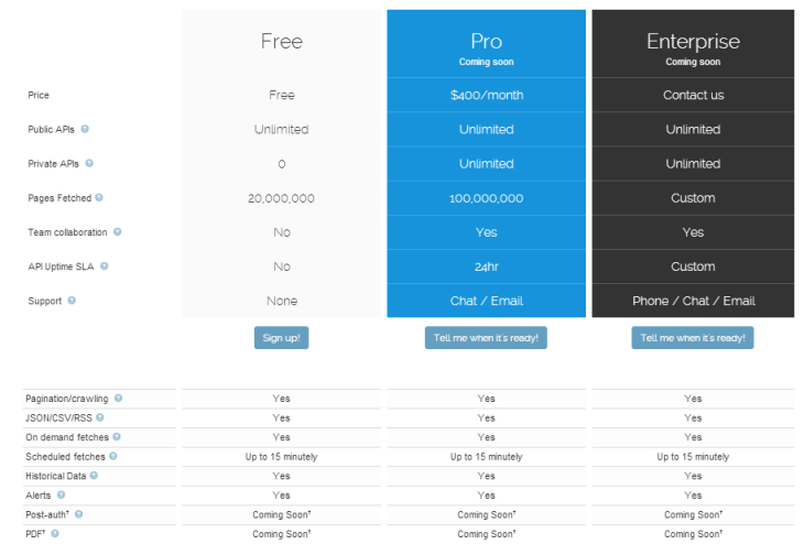 Kimono Labs allows you to extract this data either on demand or as a scheduled job. Once you've extracted the data, it then allows you to either download it via a file or extract it via their own API. This is where Kimono really shines—it basically allows you to take any website or data source and turn it into an API or automated export.