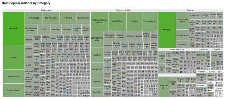 - Most Popular Authors by Category. This shows you the top contributors and the categories they are in for PPC (squares sized by Likes)
