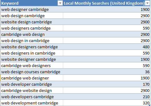 We did a keyword analysis for searches in the UK which might bring the website traffic and maybe business. These are the results.