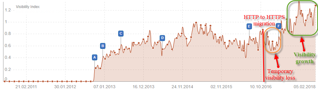 The following graph illustrates a big UK retailer’s botched site migration where the website lost 35% of its visibility two weeks after switching from HTTP to HTTPS. It took them about six months to fully recover, which must have had a significant impact on revenue from organic search. This is a typical example of a poor site migration, possibly caused by poor planning or implementation.