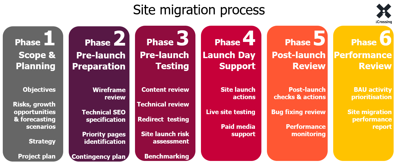 The site migration process can be split into six main essential phases. They are all equally important and skipping any of the below tasks could hinder the migration’s success to varying extents.