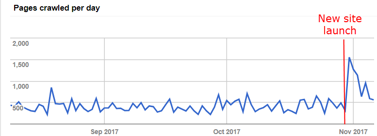 Keep an eye on the crawl stats available in the Search Console, to make sure Google is crawling the new site’s pages. In general, when Googlebot comes across new pages it tends to accelerate the average number of pages it crawls per day. But if you can’t spot a spike around the time of the launch date, something may be negatively affecting Googlebot’s ability to crawl the site.