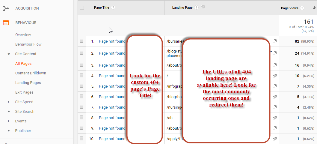 Pro tip: In Google Analytics you can easily find out which are the most commonly requested 404 URLs and fix these first!