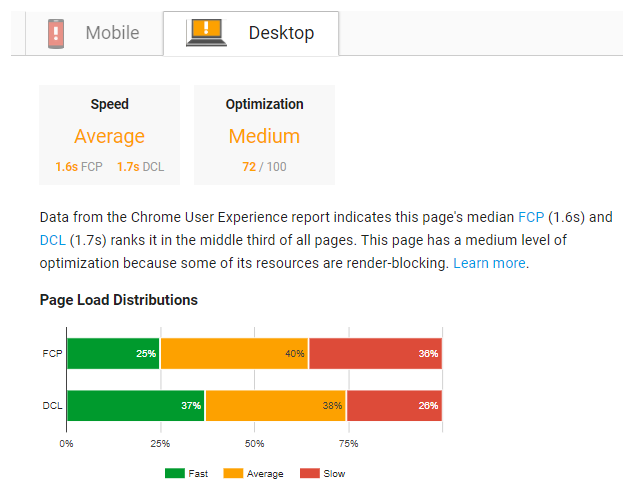 - Page load distributions: Categorizes a page as Fast (fastest third), Average (middle third), or Slow (bottom third) by comparing against all FCP and DCL events in the Chrome User Experience Report.