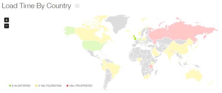 In addition, if you have access to a Real User Monitoring tool such as Pingdom, you can evaluate site speed based on the users visiting your website. The below map illustrates how different visitors experience very different loading times depending on their geographic location. In the below example, the page loading times appear to be satisfactory to visitors from the UK, US, and Germany, but to users residing in other countries they are much higher.