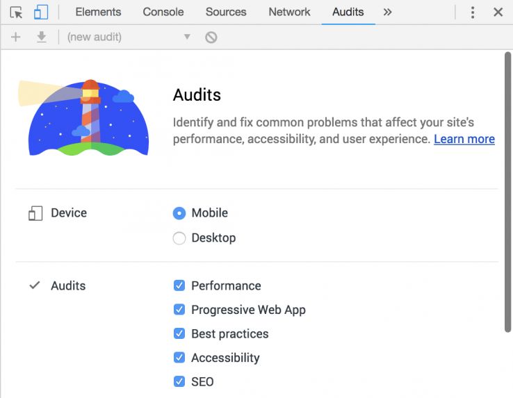 Lighthouse, one of my favorites, is available right in Chrome Dev Tools. If you are on a web page and you click Inspect Element and you open up Chrome Dev Tools, to the far right tab where it says Audit, you can run a Lighthouse report right in your browser.