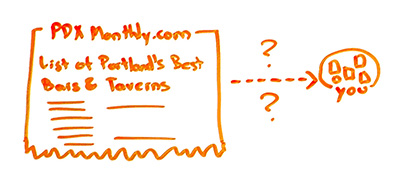 However, lots and lots of resource lists, link lists, and directories are also of great quality. For example, I searched for a list of Portland bars — Portland, Oregon, of course known for their amazing watering holes. I found PDX Monthly's list of Portland's best bars and taverns. What do you know? It's a directory. It's a total directory of bars and taverns in Portland. Would you not want to be on there if you were a bar in Portland? Of course, you would want to be on there. You definitely want those. There's no question. Give me that link, man. That is a great freaking link. I totally want it.