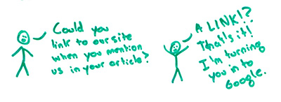 This one I understand, because there have been a bunch of cases where folks or organizations have sent out emails, for example, to their customers saying, "Hey, if you link to us from your website, we'll give you a discount," or, "Hey, we'd like you to link to this resource, and in exchange this thing will happen," something or other. I get that those penalties and that press around those types of activities has made certain people sketched out. I also get that a lot of folks use it as kind of blackmail against someone. That sucks.