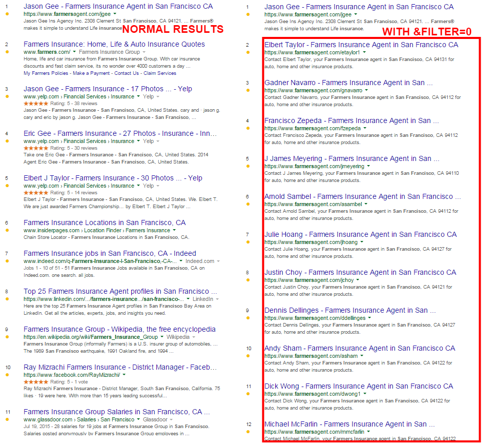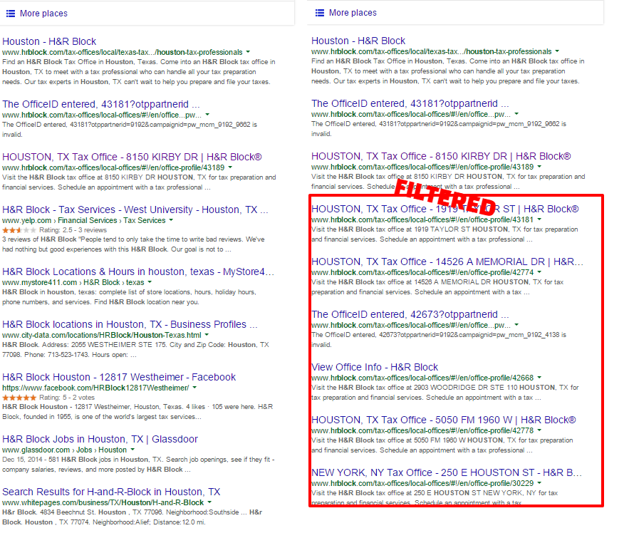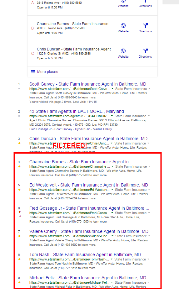 - Make the pages for your locations more different. When I compared two of the filtered pages for one insurance brand, the content on the two different agents' pages was 77% the same. I looked at two location pages for a tax accountant business in the UK and they were 81% the same. A lack of unique content is an easy way to trigger Google's filter since the pages look like duplicates. Be wary of using widgets that copy the same content to every page.
