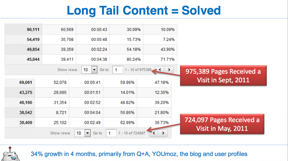 In this post I focus primarily on community building. At SearchLove last year, Rand had a slide stating a 34% growth in 4 months, primarily from Q+A, YouMoz, the blog and user profiles. Add to this that community members are some of the best link builders you'll ever find. Getting community right is a huge win.