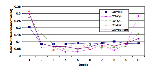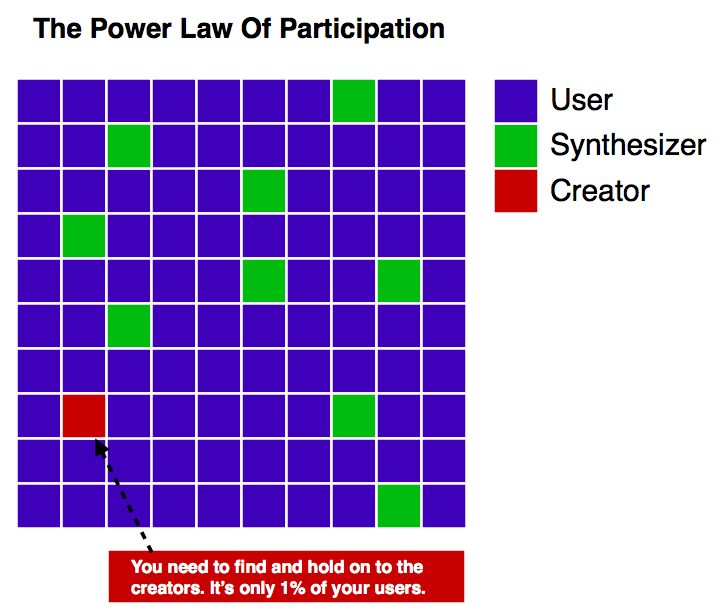 Despite the overall participation trend identified by Michael Muller, some people are more likely to contribute more to new communities than others. In fact, only few people end up participating in the first place. Google+ VP Bradley Horowitz once wrote about 90-9-1 principle, describing how 1% of community members are creators, 9% are synthesizers, and the remaining 90% are users/lurkers who do not directly add anything to the community.