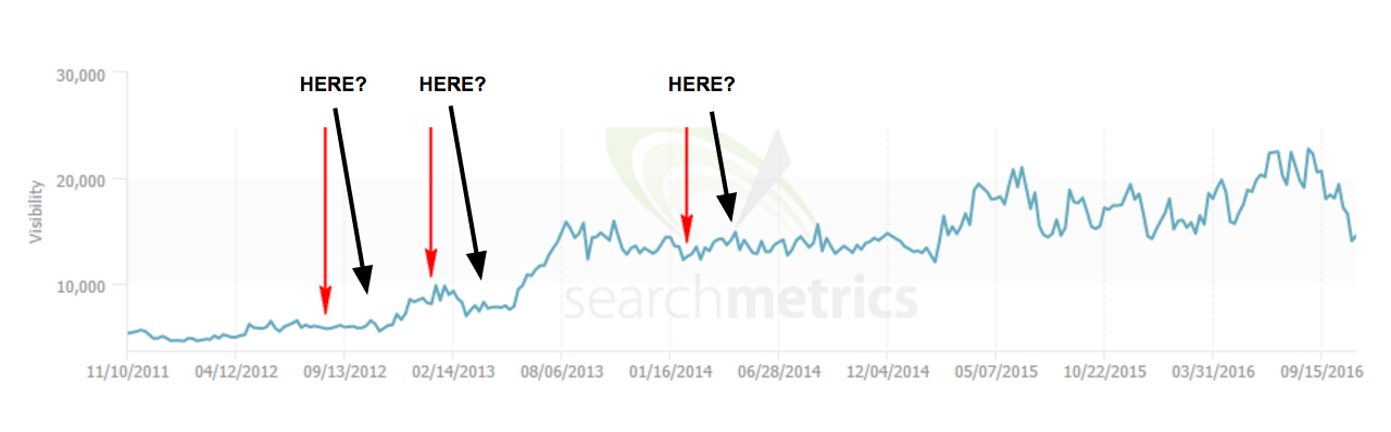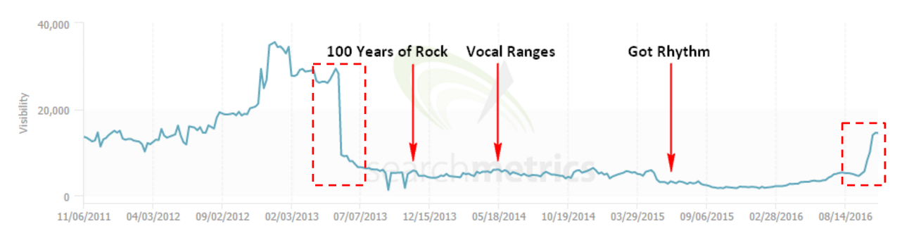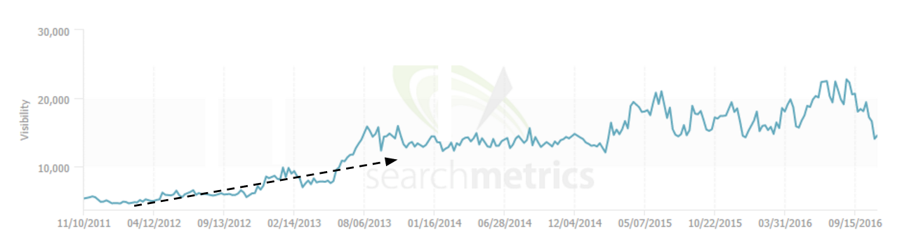 Below is the graph from SearchMetrics for Concert Hotels, also via the original post. This is another site to which Distilled built a high volume of links.