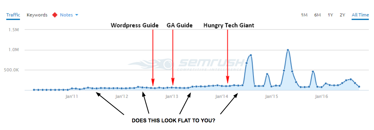 To hold up, the myth required a directly attributable jump in rankings and organic traffic within approximately 3 months of the release of each piece of content. So where was the bump? The anticipated reward for all those links?