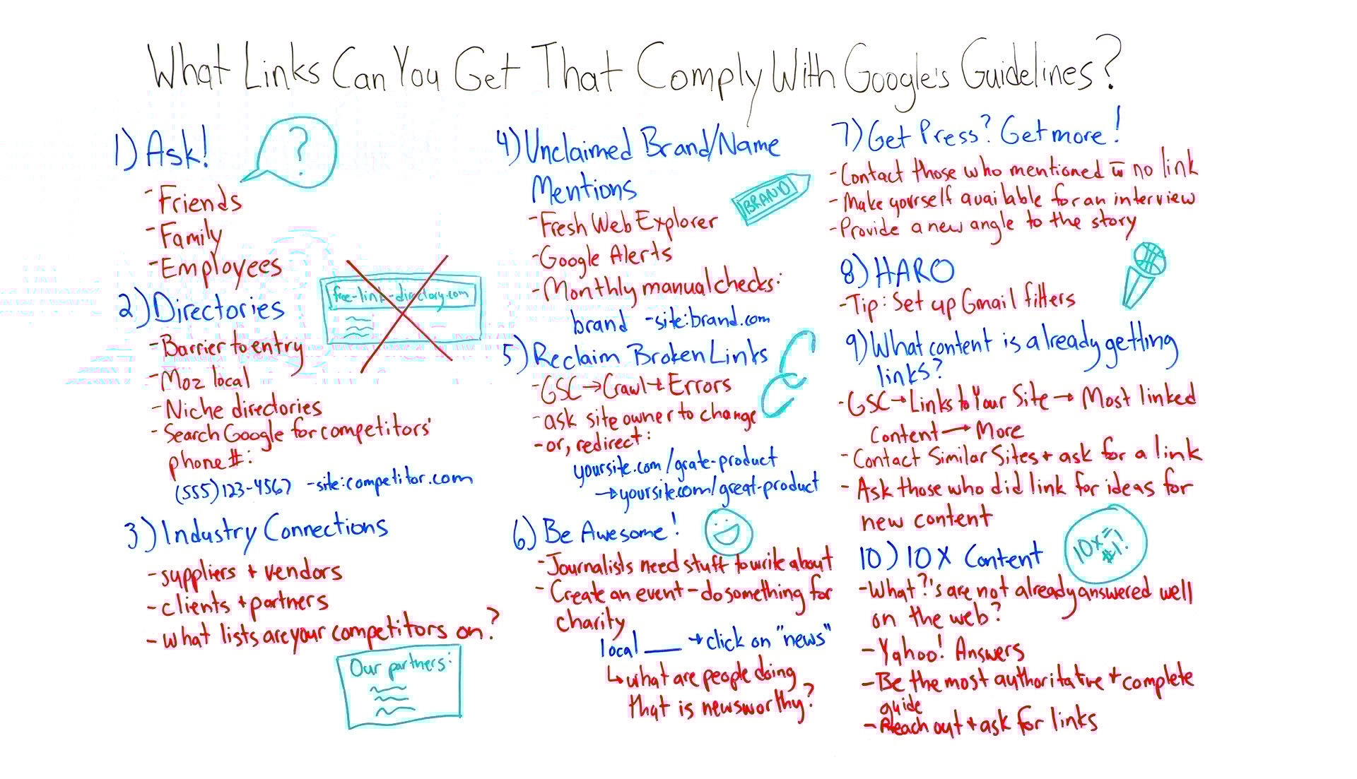 So these are 10 ways that you can get links that will comply with Google's guidelines and really should make a difference in your rankings. These are going to be harder than just going to a free link directory or using some spammy techniques to make links, but if you can do this type of thing, it's the type of thing that really moves the needle. You don't need to be worried about the Web Spam Team. You can be proud of the types of links that you're getting.