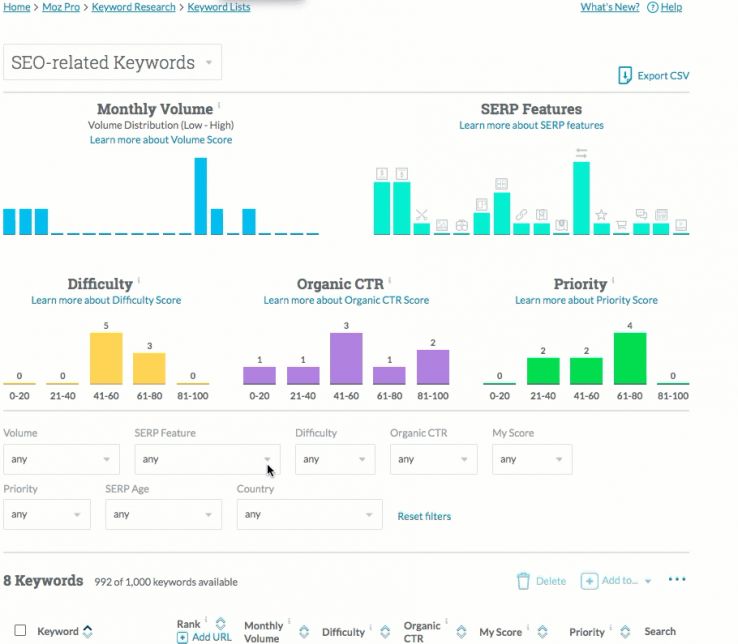 Having trouble prioritizing keywords? Identify opportunities for featured snippets and other SERP features faster than ever. If you already have a keyword list in Keyword Explorer, simply hop into the list and refresh all keywords. Once the list is refreshed, you’ll be able to quickly view, filter, and export SERP Feature data for your keywords.