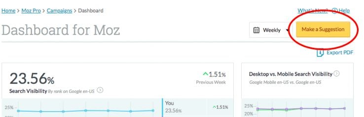 When you hop into a Campaign, you’ll notice a button on the top of your Dashboard that says “Make a Suggestion.” A click of this button will give you the power to tell us what you want to see. We love hearing from you and we're always looking for ways to iterate and improve our product for you so that your job as an SEO is as easy as possible.