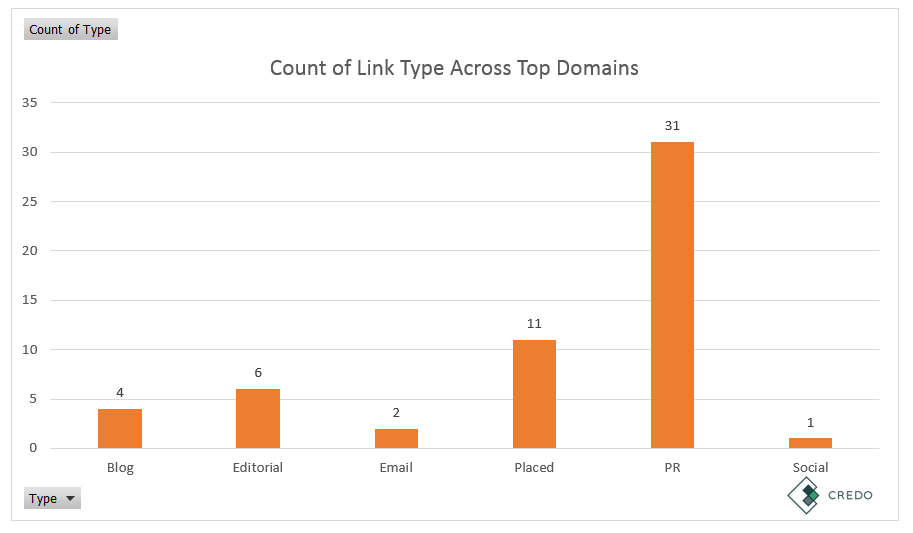 I was then curious about the type of links these are. So, I went through and categorized them accordingly. Remember, there are 55 unique domains here so this isn’t quite representative of all of their links, but if you’re looking to build a bed of links for your company this should give you an idea of the channels that work: