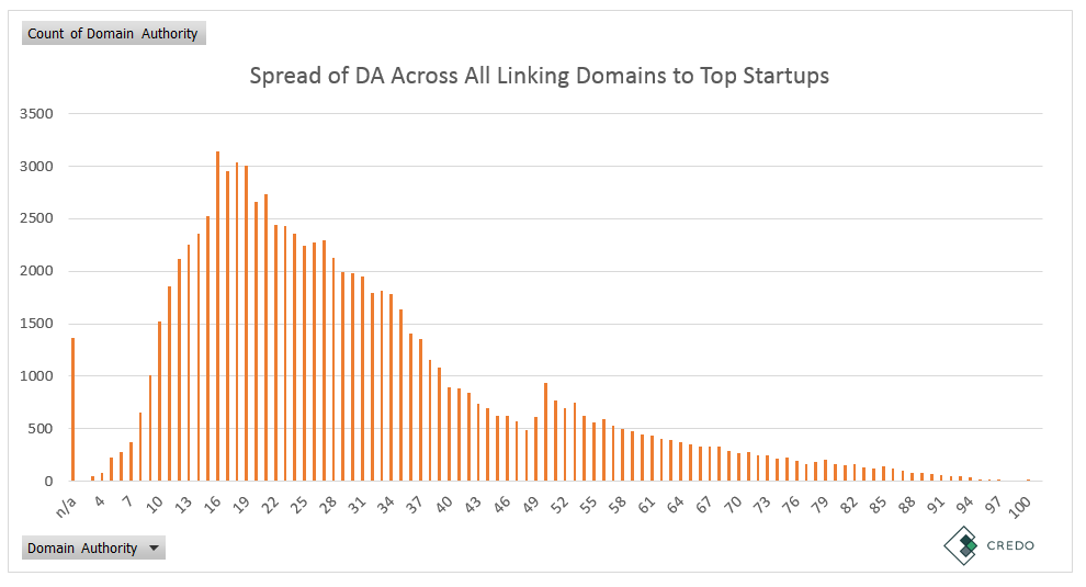 As you can see, the overall link spread of the top 100 startups is pretty in line with what one could consider "normal." I'm sure you can find anomalies at an individual site level, but at a 10,000-foot view, they’re natural. This is important because it means that at least most of these startups are not actively manipulating the link graph in a way that could hurt them in the future. Basically, don’t pull a Thumbtack.
