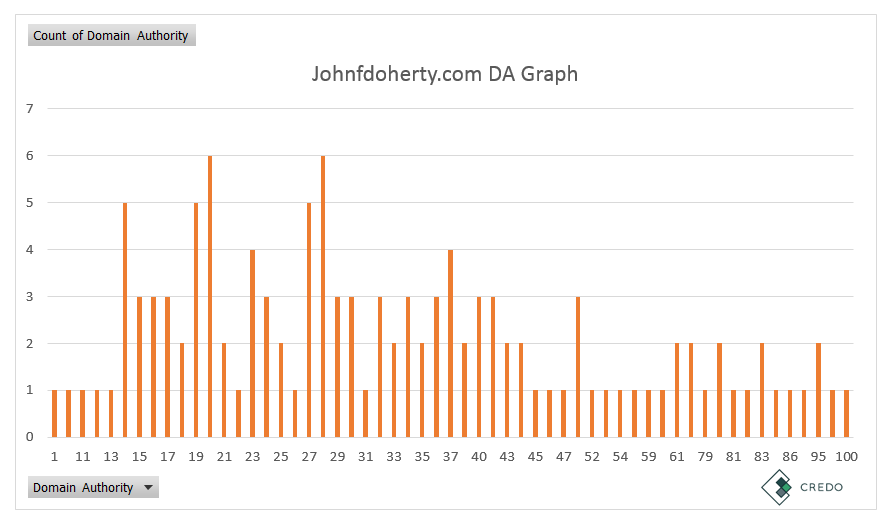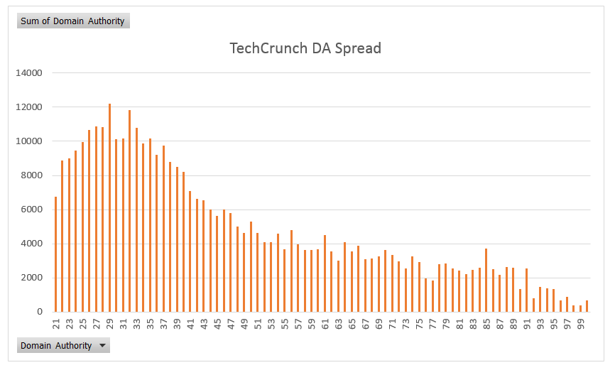 The next question I asked myself was how natural-looking their backlink profiles are. To do this, I graphed the Domain Authorities of all the domains pulled from OSE as linking to these sites. To make it as accurate as possible, I de-duplicated the domains before making this graph.