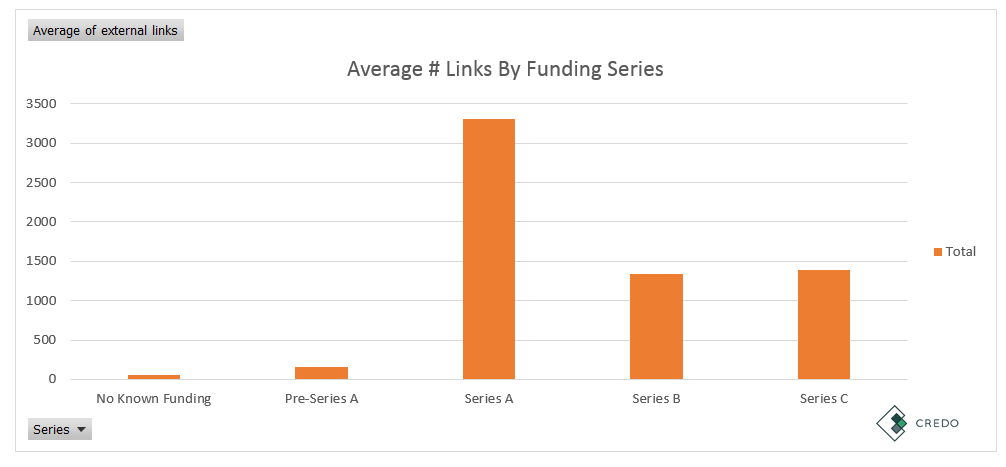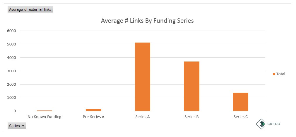 When we remove Porch and Crowdrise from the dataset as outliers, we get a much clearer view of the landscape. Series A companies still have more links on average than Series B or C, which may be explained by the increasing proliferation of tech blogs and the recent funding boom that that occurred in 2013–2015 (which now seems to be cooling). Here’s the look: