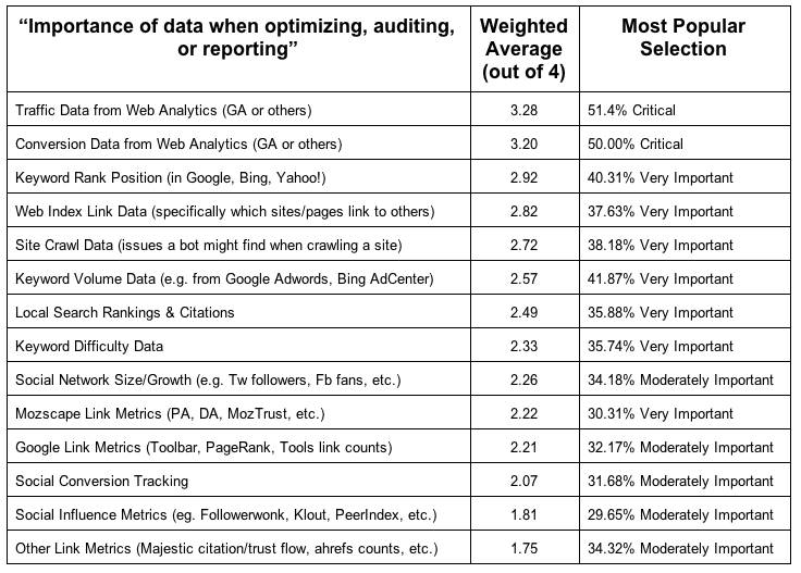 The results are in! 780 readers completed the survey, with just under half being SEOmoz customers. The top five data sources for our readers include Web Analytics, Conversion Data from Web Analytics, Keyword Rank Position, Web Index Link Data, and Site Crawl Data. For your viewing pleasure, here is the complete list of results: