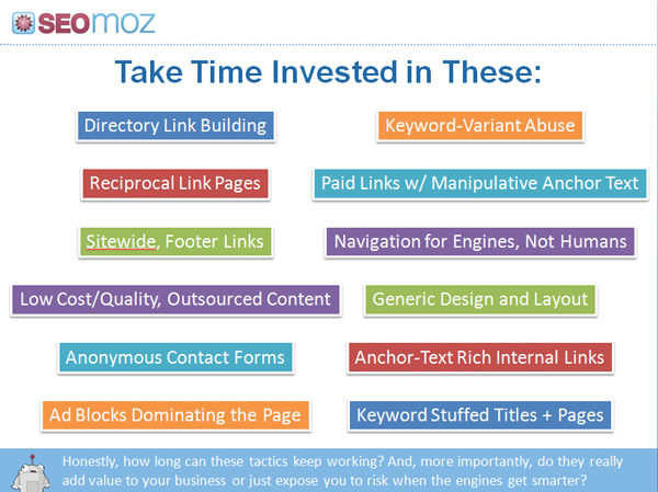 - You're renting rankings rather than buying them. Devaluation of spam tactics means you have to stay one step ahead of the engines, and can never spend a week free from sweating what will and won't be found. White hat may take longer, but, if done right, it can build an unassailable position of strength long term.