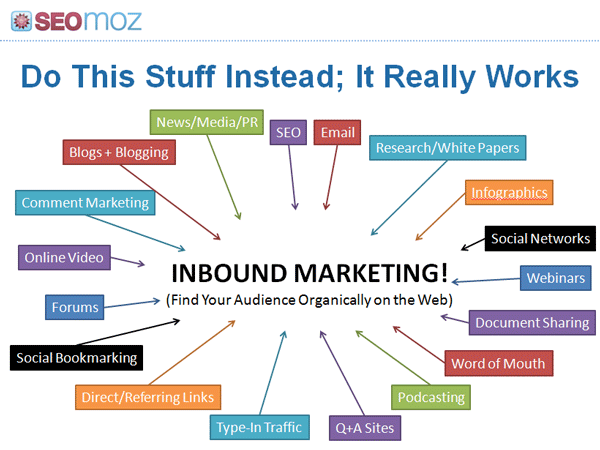 - Spam never builds value in multiple channels. What I love about the inbound/organic marketing philosophy is how it builds a site that attracts authentic traffic from hundreds of sources, often without any additional work. Spamming your way to a #1 ranking might send search traffic, but if the web shifts to Facebook/Twitter or if email marketing becomes the biggest tactic in your niche, or if a competitor wins purely on branding and branded search, you're up a creek. You've built nothing of real value - nothing to make people come back and share and like, +1, tweet, link, email, stumble, vote for, shout to the heavens about. Spam builds a shell of a marketing strategy; one crack and it's all over.