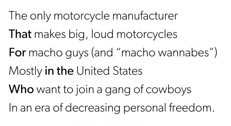 With this formula you can quickly, clearly — and most importantly, in a very human way — communicate your positioning and your purpose. This is Harley Davidson’s: