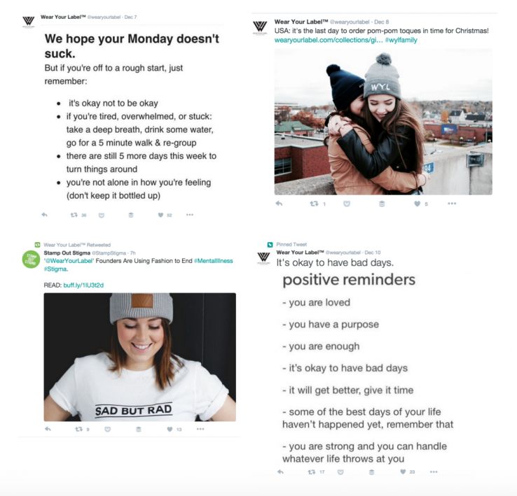 On social, their feed is refreshingly human. On Twitter there’s a balance between self-promotion and igniting a connection. It’s real people wearing their clothes, providing daily self-care reminders, and everything is a reflection of their purpose. Wear Your Label is off to a great start as a brand and is doing a ton of good stuff to earn credibility and build relationships that will, over time, result in a strong community and a profitable customer base.