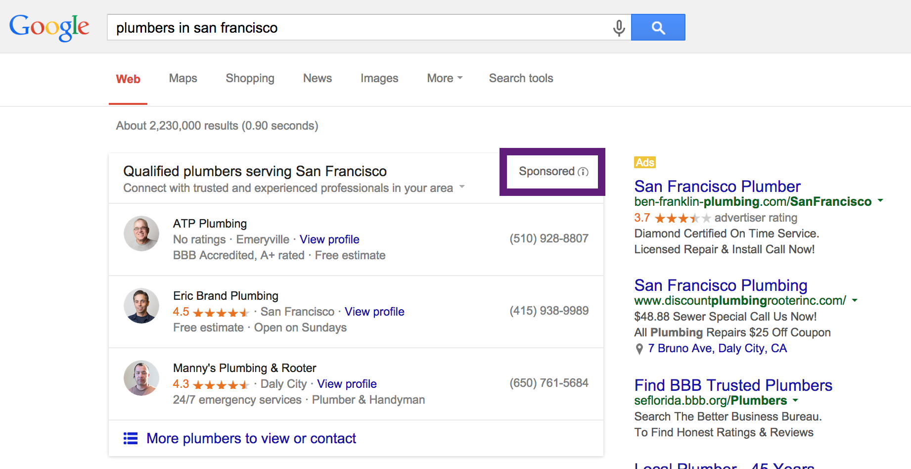 Let's go back to my last example, "plumbers in San Francisco." Look at what's happening above the fold with that query: