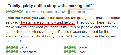 Within a coffee shop business, the staff are just as important as the food/drink itself. In some cases they are more important. If you have built in strong customer service that sets you apart from your competitors then, believe it or not, people will talk about you. Considering the work that goes into building local citations and reviews for SEO, utilising your staff to encourage these makes sense.