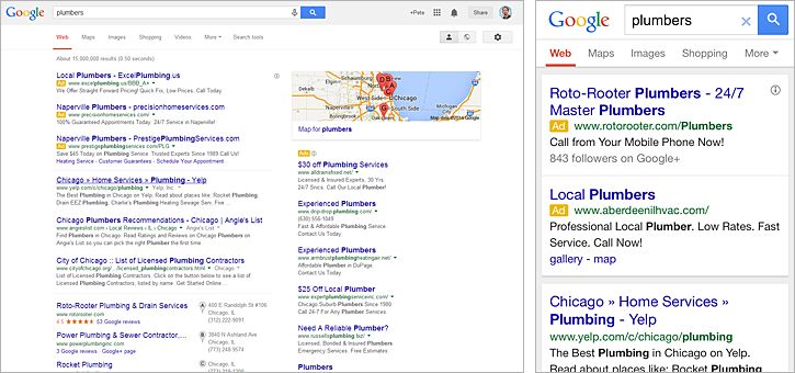 Here’s a fairly basic SERP (a search for “plumbers”) with ads and some local features. The desktop version is on the left, and the mobile version is on the right. I apologize for the reduced size, but I felt that a side-by-side version would be the most useful: