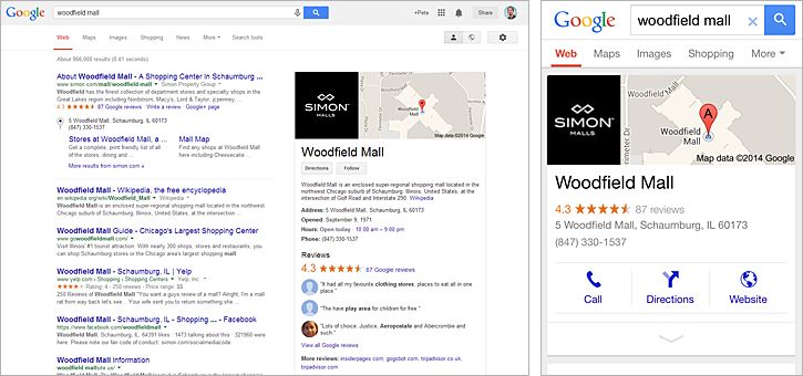 Let’s look at a standard Knowledge Graph box, in this case one for a local entity (“woodfield mall”). Here, while the styles of the Knowledge Graph boxes are similar, the SERPs are radically different: