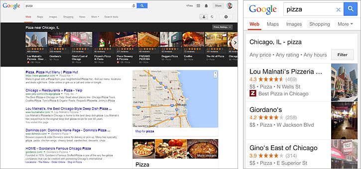 Finally, let’s consider a SERP where the presentation and structure are completely different between desktop and mobile. This is a search for “pizza” (from the Chicago suburbs, where I’m located), which triggers a local carousel: