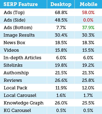 The table below shows the presence of features across both desktop and mobile SERPs. Data was recorded on June 5th. Both data sets were depersonalized and half of the queries (5K) were localized, to five different cities.