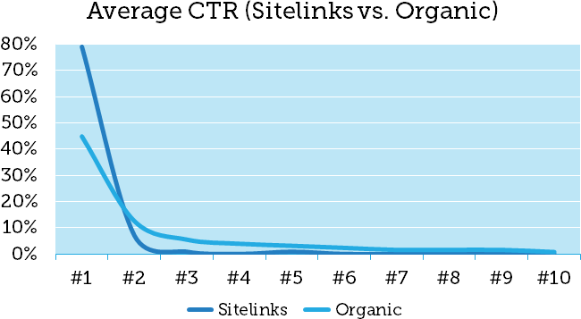 Various studies show the starting point at various places, but the shape itself is consistent and familiar. We know, though, that reducing everything to one average ignores a lot. Here's a dramatic example. Let's compare the organic curve to the curve for SERPs with expanded sitelinks (which are highly correlated with dominant and/or branded intent)...